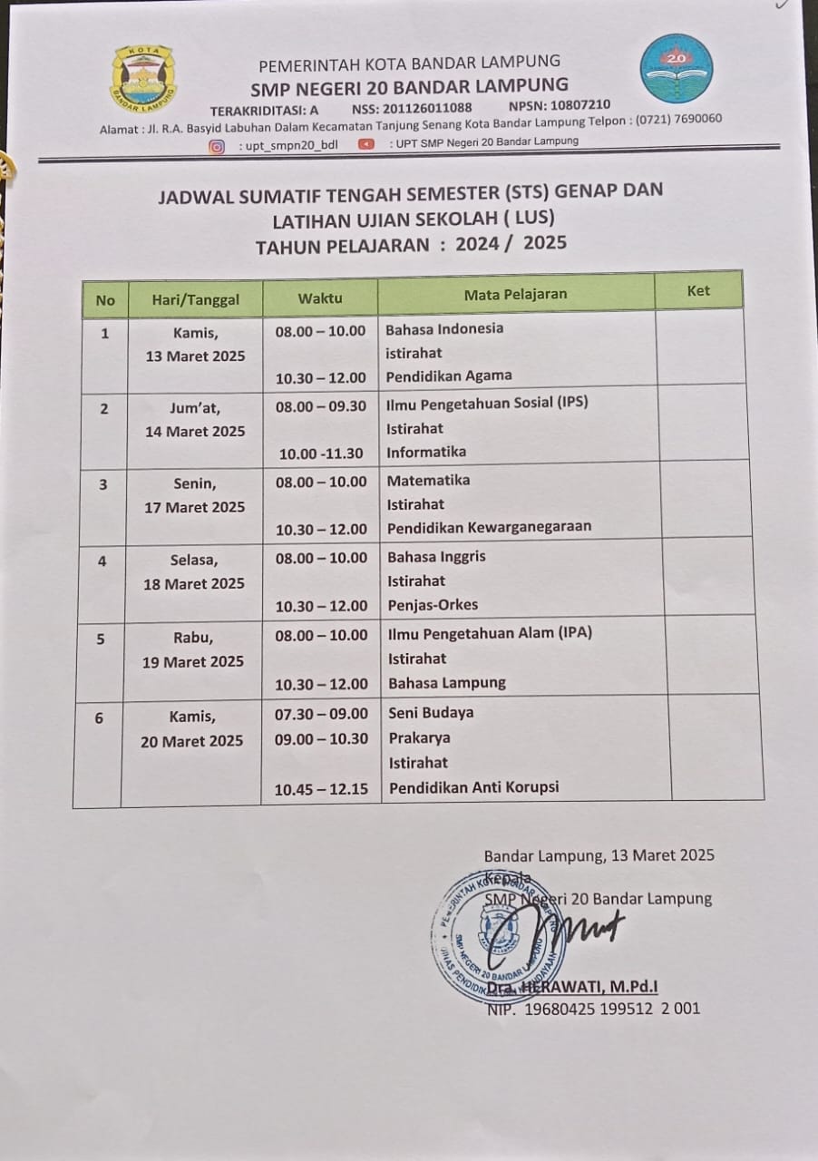| 7 | PERSIAPAN UJIAN AKHIR SEKOLAH SMPN 20 BANDAR LAMPUNG TA. 2024-2025 | 2025-04-24 12:50:35 | Download |